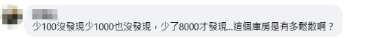 针对此事,有岛内网民质疑,“少100没发现,少1000也没发现,少了8000才发现,这个库房是有多松散啊?”