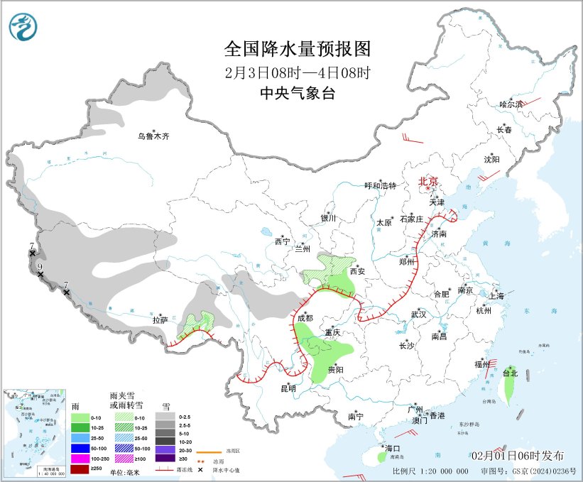 2月2日08时至3日08时,黑龙江西北部、新疆南疆南部、西藏西部和东部、青海南部、甘肃南部、川西高原北部等地部分地区有小雪或雨夹雪,其中,西藏东部等地部分地区有中到大雪(5~8毫米)。西藏东南部、陕西南部、四川盆地东部和西部、贵州西部、台湾岛大部等地部分地区有小到中雨。内蒙古中东部、黑龙江南部、山东半岛等地部分地区有4~5级风。